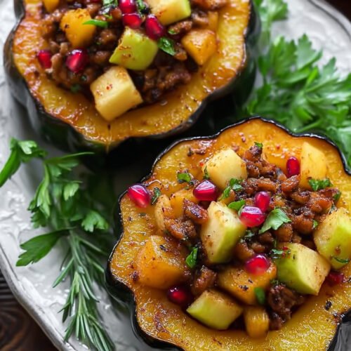 I roast acorn squash on cool evenings when the kitchen feels calm and the oven hums. This acorn squash recipe keeps things simple and warm. The apples turn soft. The squash turns sweet. We swipe a spoon and the filling gives off steam that smells like cinnamon and butter. I once made it for a friend who swore they did not like squash. They ate seconds. I kept the leftovers for breakfast and felt no shame. We scoop the centers, toss crisp apples with brown sugar, cinnamon, nutmeg, and a splash of lemon. Pecans add crunch. A touch of butter melts into the fruit and sends flavor into every bite. The squash cups go tender in the oven and the tops caramelize. The house smells like fall. You may find folks drifting into the kitchen to ask what on earth you are making and can they stay. Want a win on busy nights. Bake the squash while you set the table. Want a cozy side for roast chicken. It fits right in. For fans of stuffed acorn squash recipes and acorn squash recipes this also reads like an easy path to acorn squash recipe soup next day. It might be the best squash recipe or your new butter squash recipe or even your green squash recipe in spirit.
