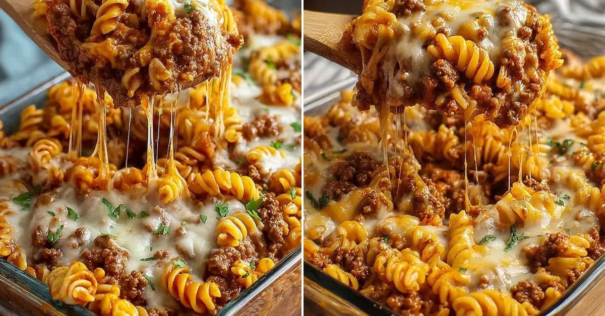 - This cheesy bake combines pasta, ground beef, and layers of melted cheese.