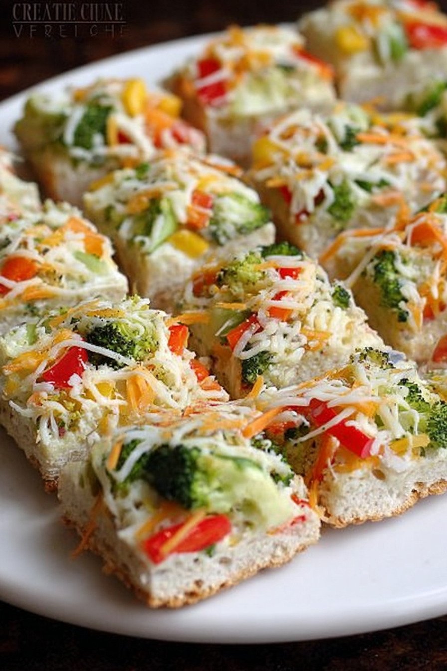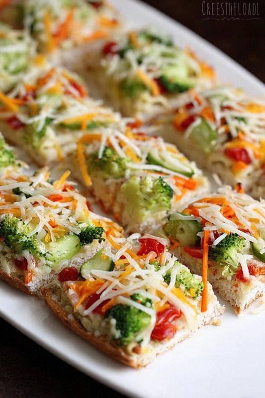 The crust bakes once and cools. A cool ranch style spread meets crisp veggies. Each bite snaps then melts a little. Friends reach for squares and the tray clears fast. This fits light meals and quick hangs.