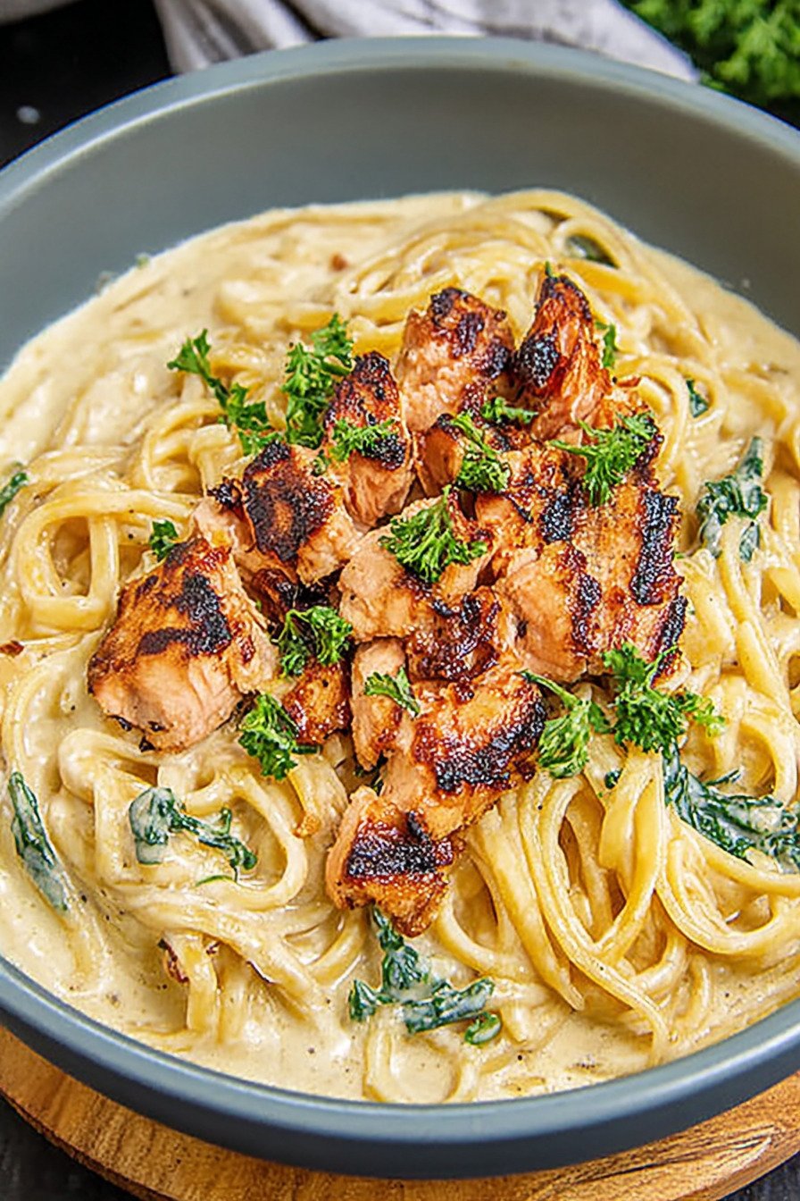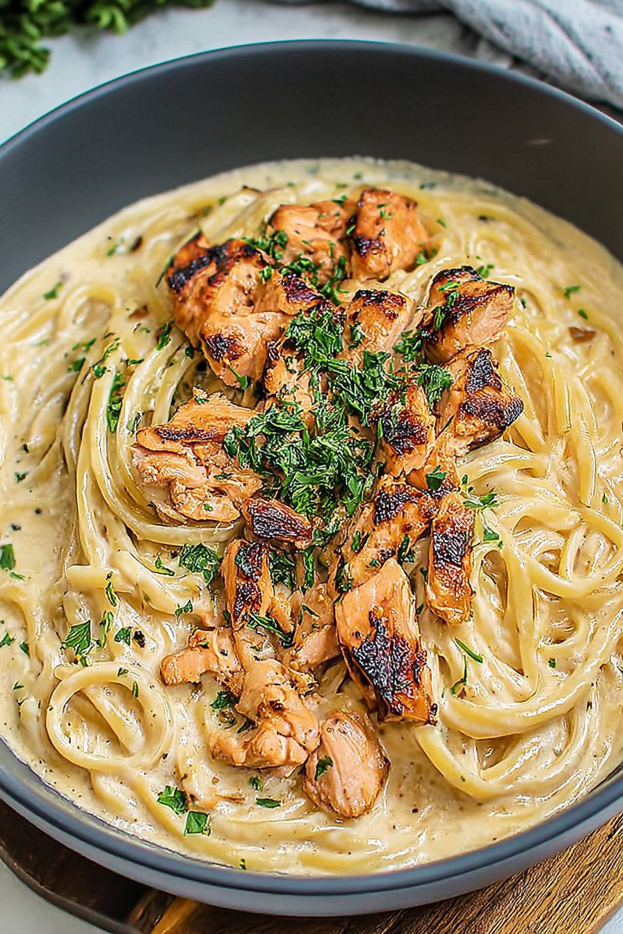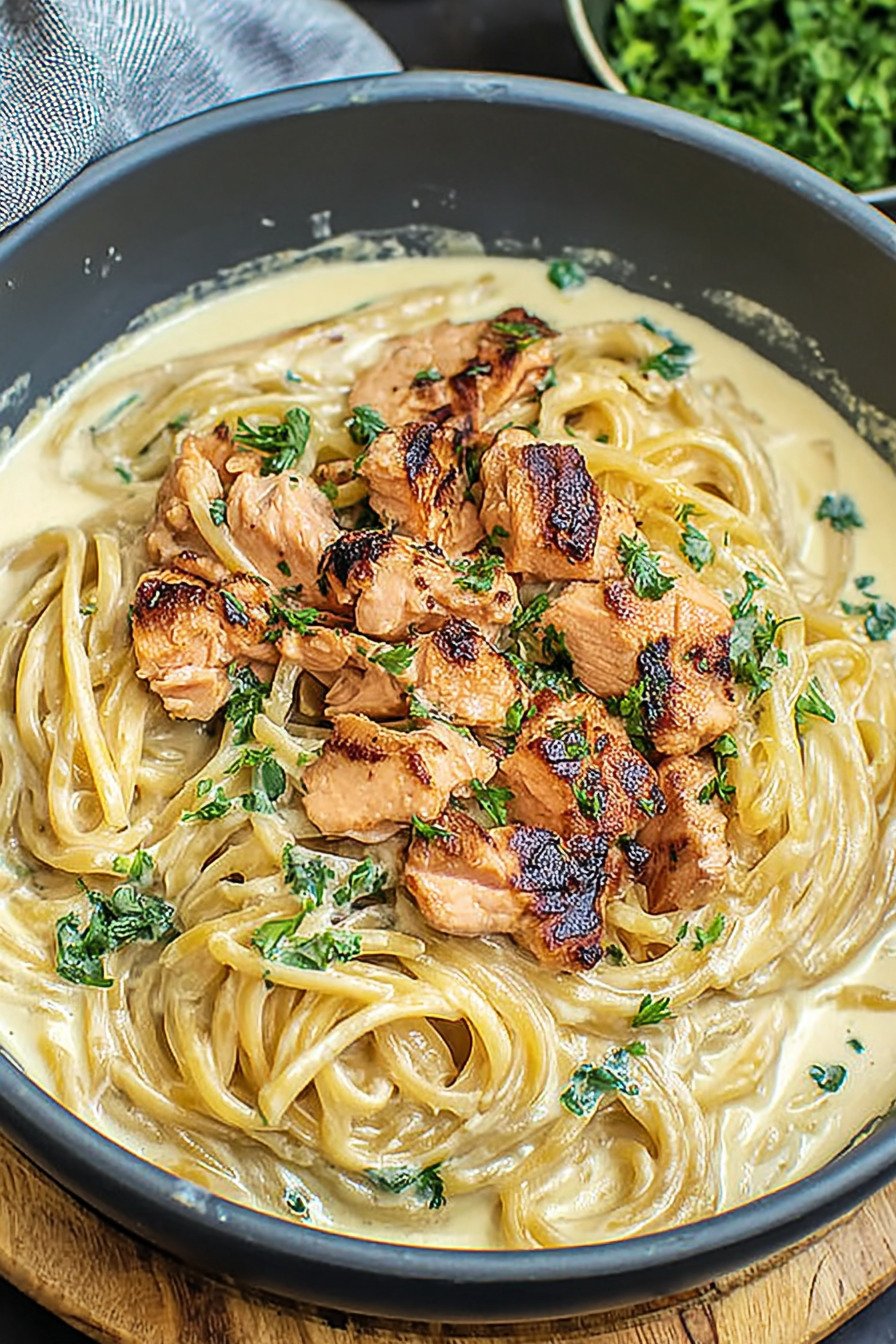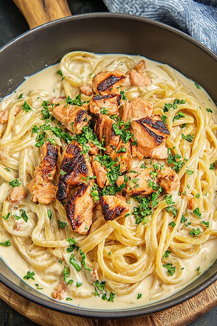 Salmon Fresh salmon is the star of this dish, providing a rich, flaky texture and a naturally buttery flavor that pairs beautifully with creamy sauces.