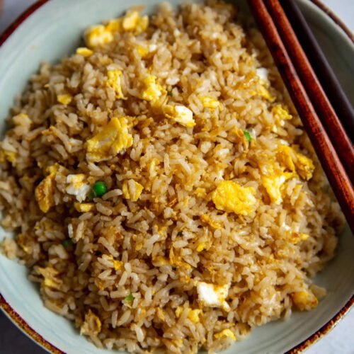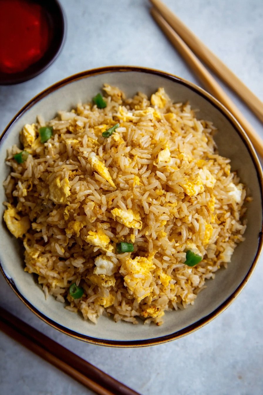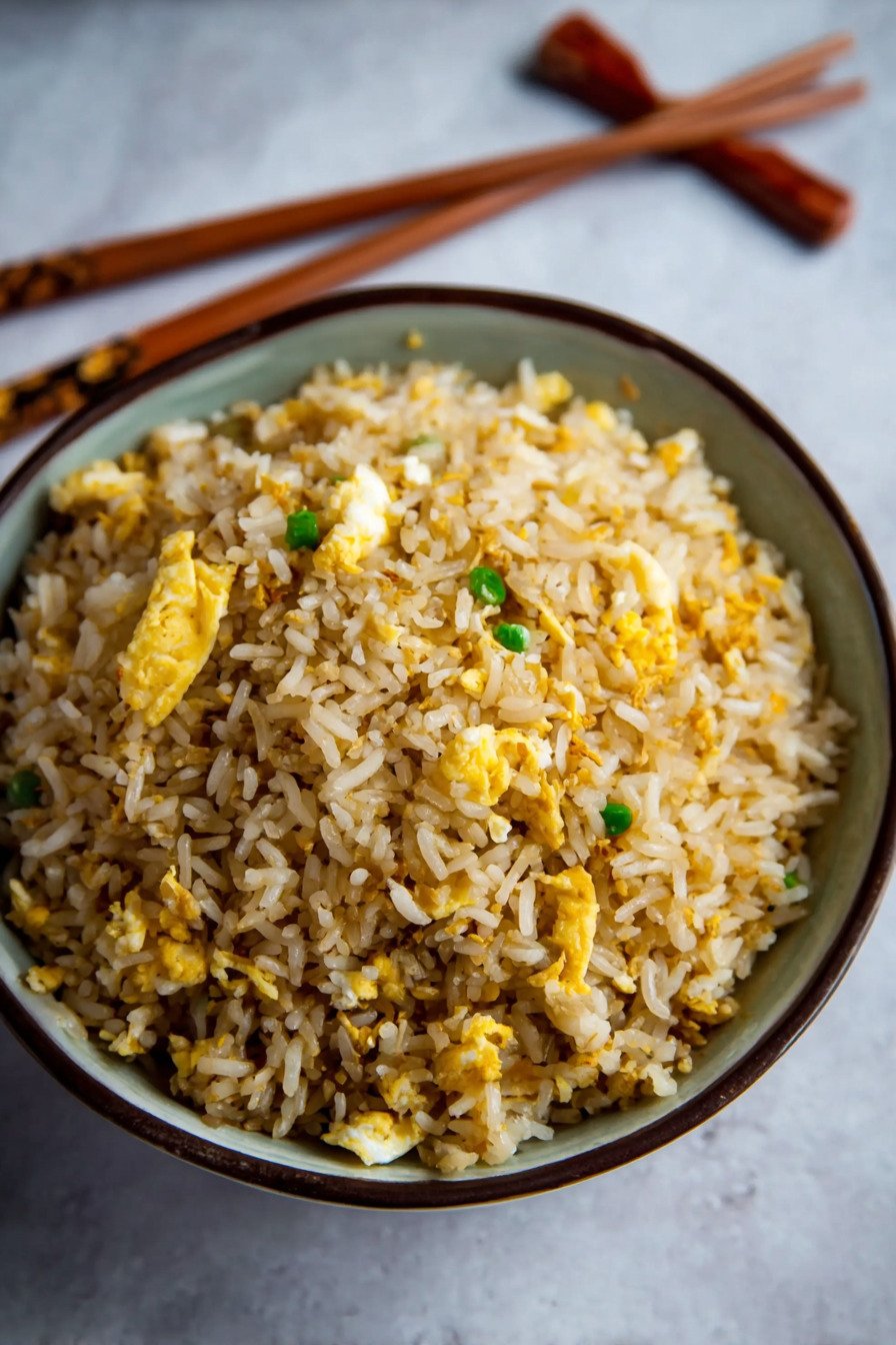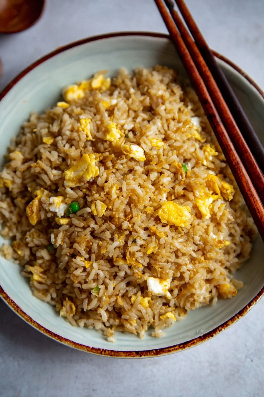 Eggs Eggs cook fast and fold into the rice with ease. I scramble them first so they stay soft. They add protein and rich flavor without weighing the dish down.