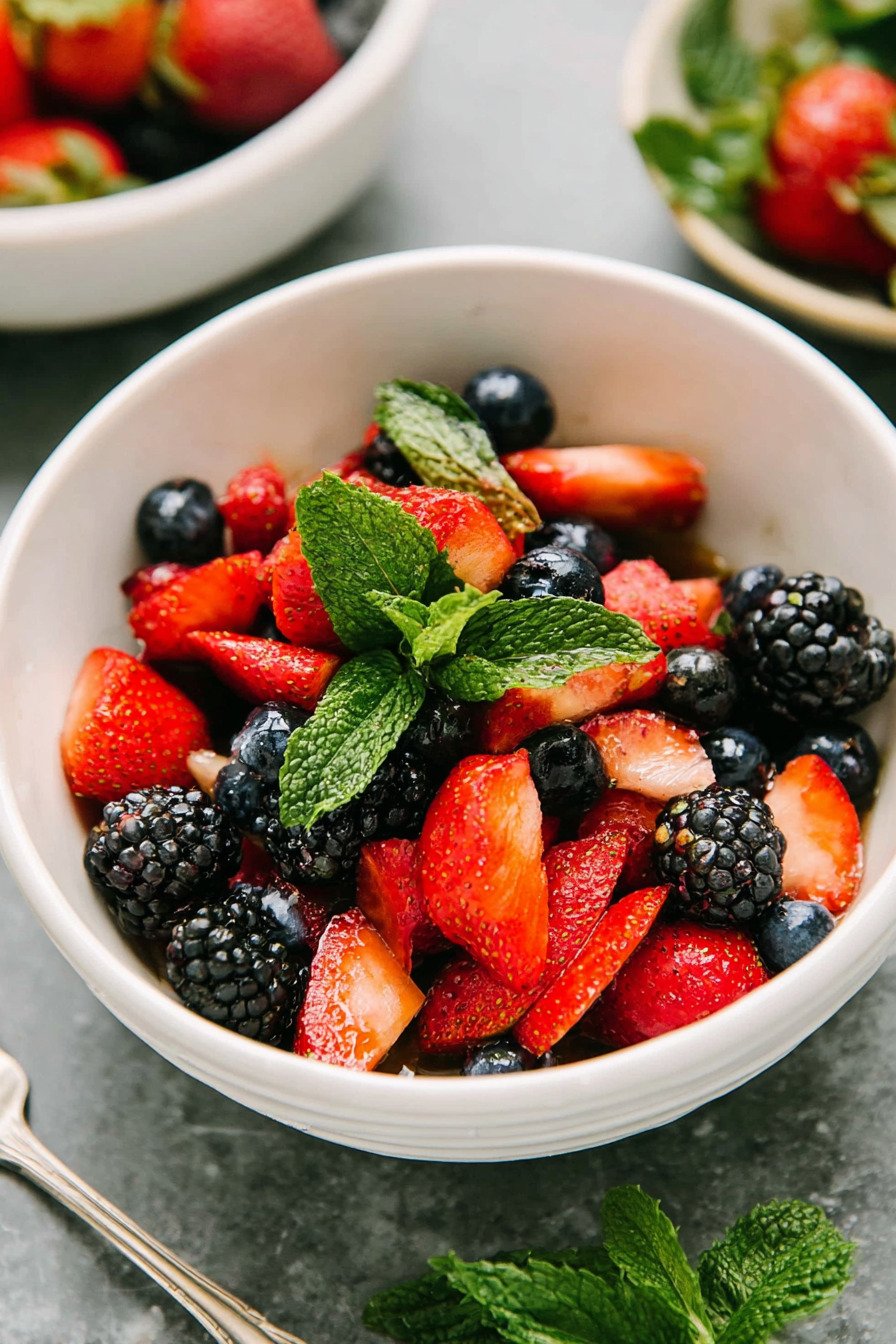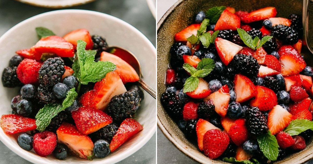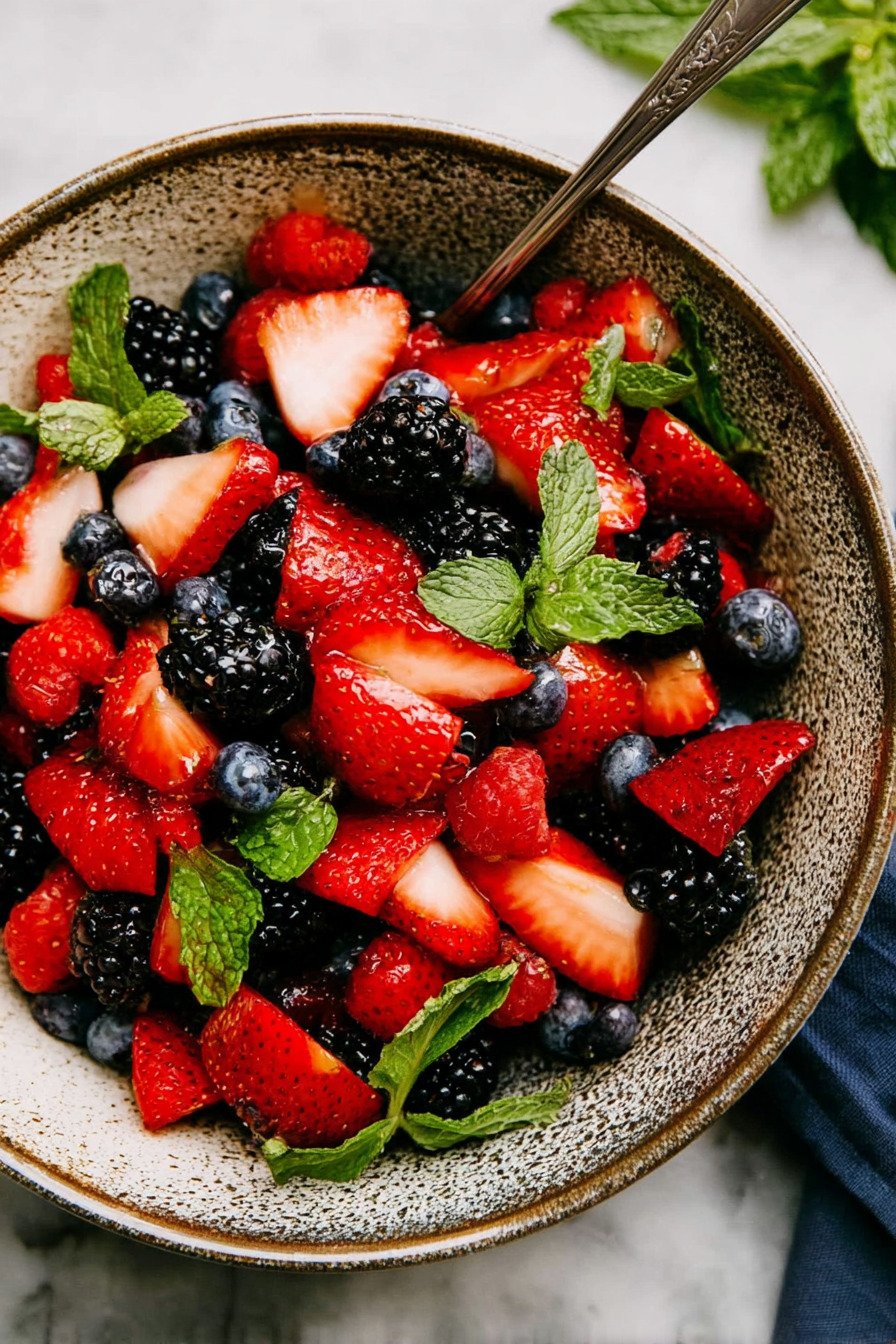 We aim for soft edges and clean bites. Strawberries give body. Blueberries bring pop. Raspberries add a tender note. Mint wakes the flavor. The dressing stays light so the fruit leads.