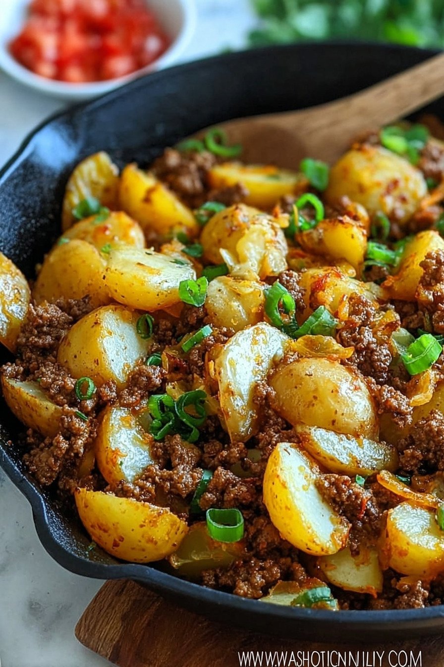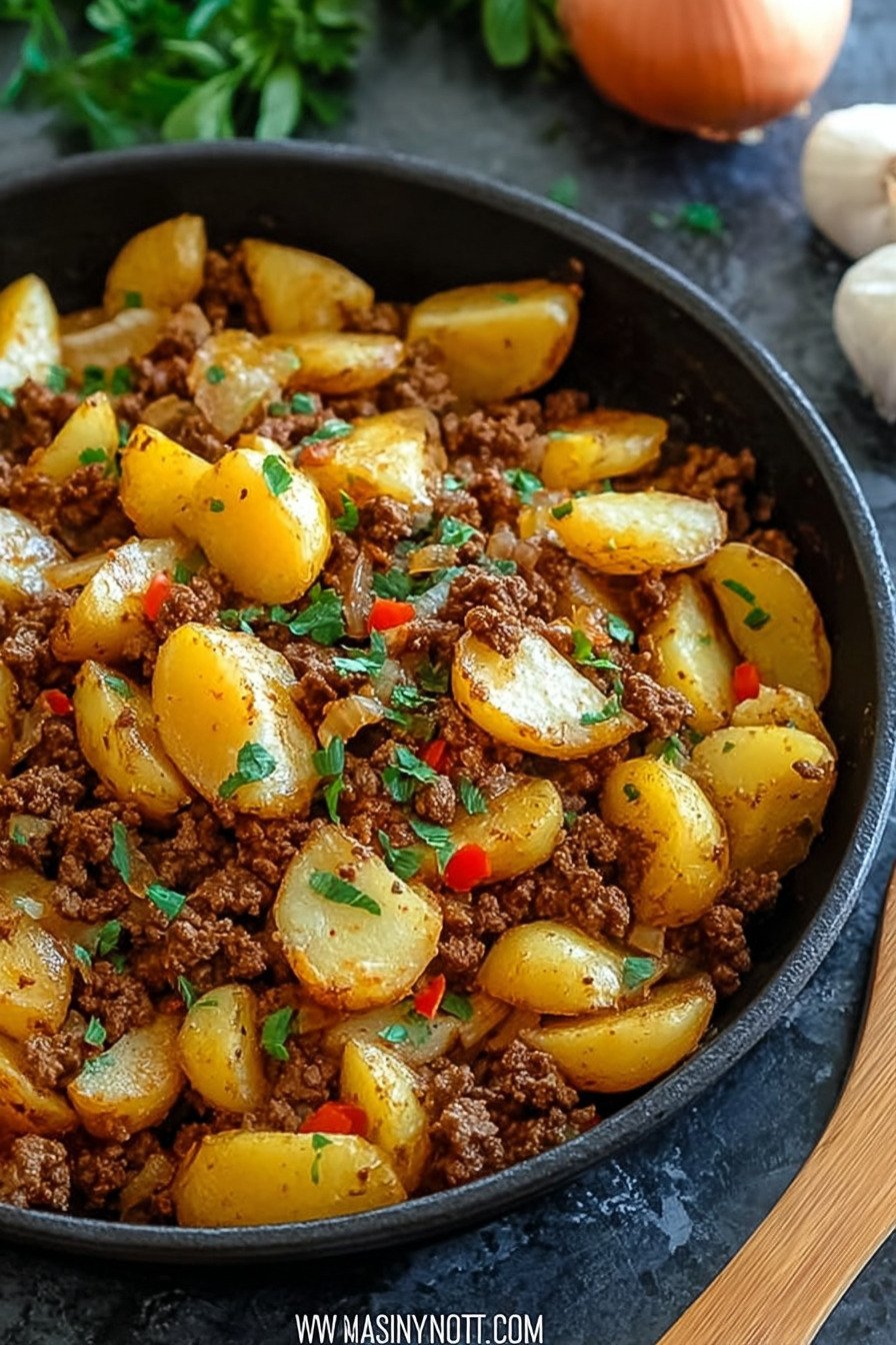 We cook this skillet when time runs tight and hunger shows up. The method stays plain and trusted. Brown beef. Soften onion. Crisp potatoes. Fold everything together for deep flavor and a cozy plate.