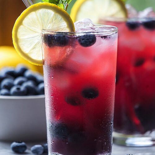 Garnishes: Lemon slices and extra blueberries. They’re optional, but I love the way they look swirling around the drink.