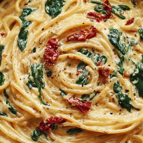 When I first made this dish, I wasn’t sure if spaghetti and spinach could pull off being a power couple, but one bite of that sun-dried tomato cream sauce and I was sold. It’s the kind of meal that balances cozy and light, creamy yet fresh. You know those recipes that make you pause mid-bite because they’re that good? This is one of them. I like to think of it as my answer to busy weekdays when I want something quick but not boring. The sauce hugs the pasta, the spinach wilts just enough to soften, and the sun-dried tomatoes? They bring this sweet, tangy kick that makes the whole dish shine. Honestly, I catch myself sneaking extra spoonfuls straight from the pan before it even makes it to the plate. This recipe also sneaks into the healthy lunch recipes category without trying too hard. It’s flavorful, filling, and doesn’t leave you with that heavy post-meal slump. Whether you’re into sun dried tomato recipes, searching for the best spaghetti sauce recipe, or you just want chicken and spinach recipes healthy enough to fit your goals, this covers it. It even doubles as one of those recipes healthy lunch fans keep in their rotation, especially if you love spinach recipes healthy or spaghetti and chicken recipes that actually taste amazing.
