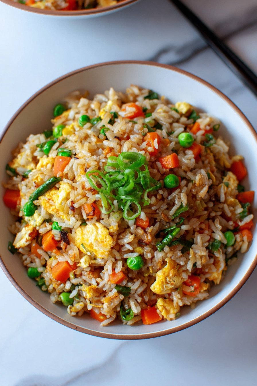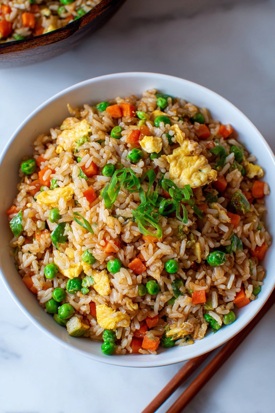 One bowl offers a balanced mix of rice eggs and veggies. You get carbs for quick energy protein for staying power and fiber from peas and carrots. Use low sodium soy if you watch salt. Add more veggies to boost volume without making the dish heavy.