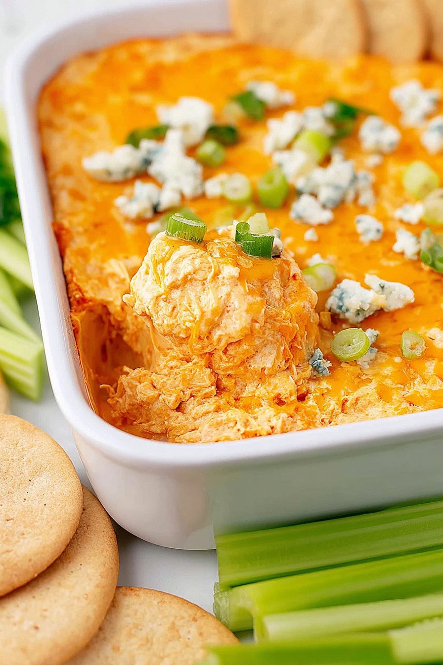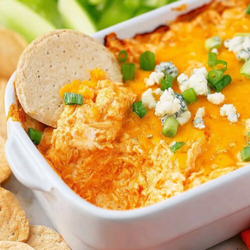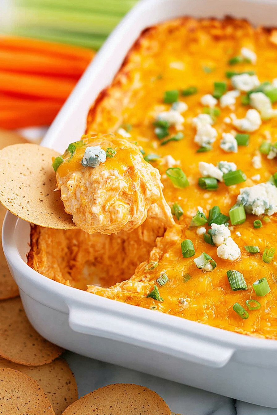 For an oven kiss spoon the hot mix into a small dish then broil until the top bubbles. This mirrors a buffalo chicken dip recipe oven method and gives a light crust.