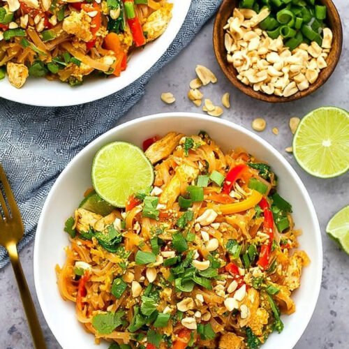 For best texture, cook noodles fresh. You can still prep the rest. Chicken can be sliced and chilled. Peanuts can be chopped. Lime can be cut. That light prep turns a busy night into a smooth glide.