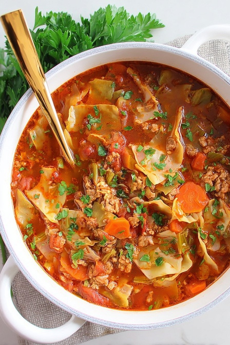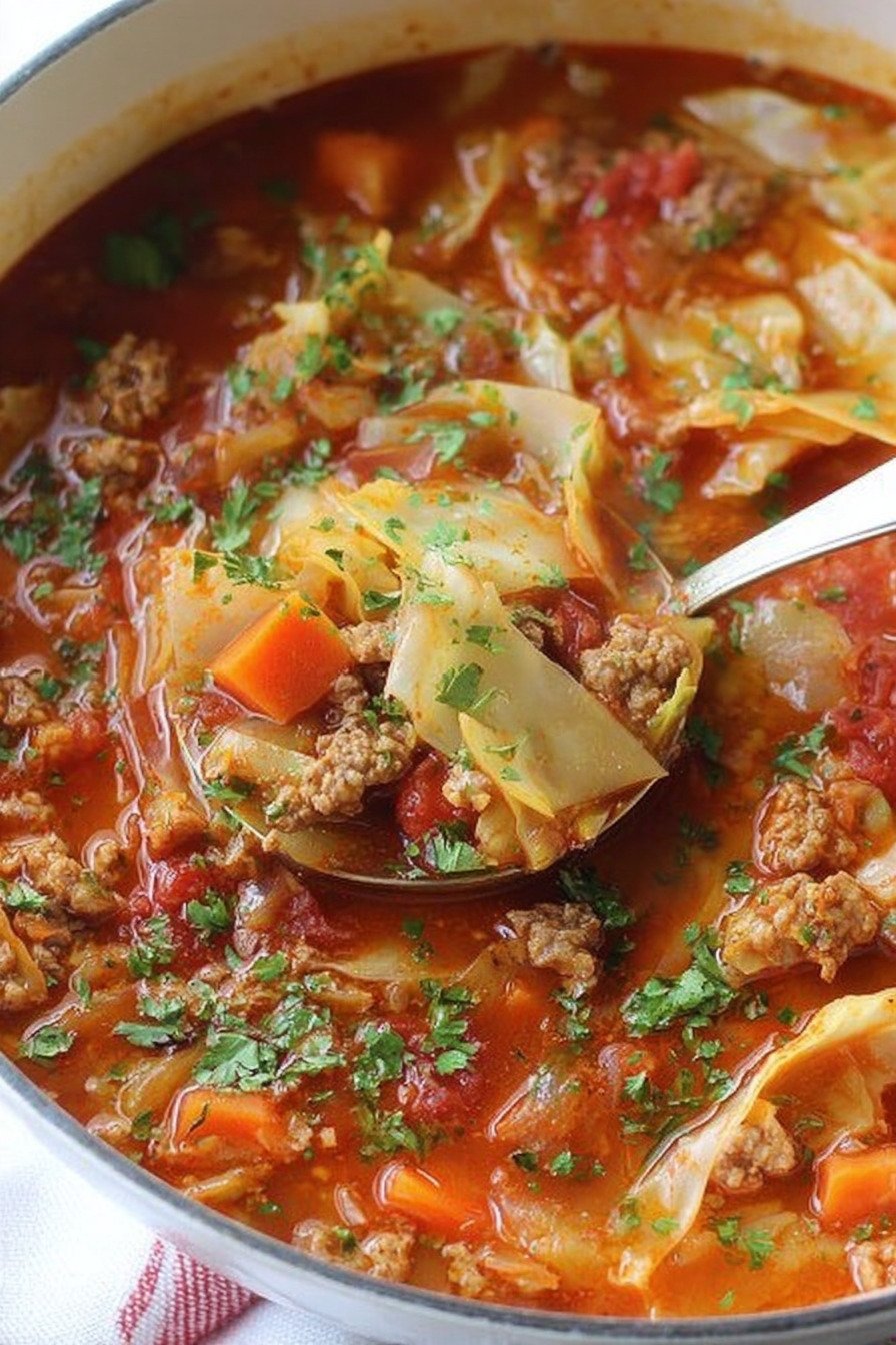 Ground Beef Ground beef gives this soup its hearty, savory base and brings in the classic flavor people love in traditional cabbage rolls. It also adds richness and protein that make the soup feel like a complete meal.