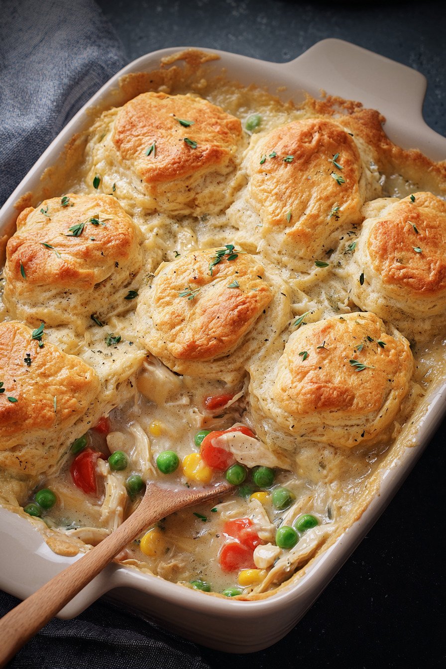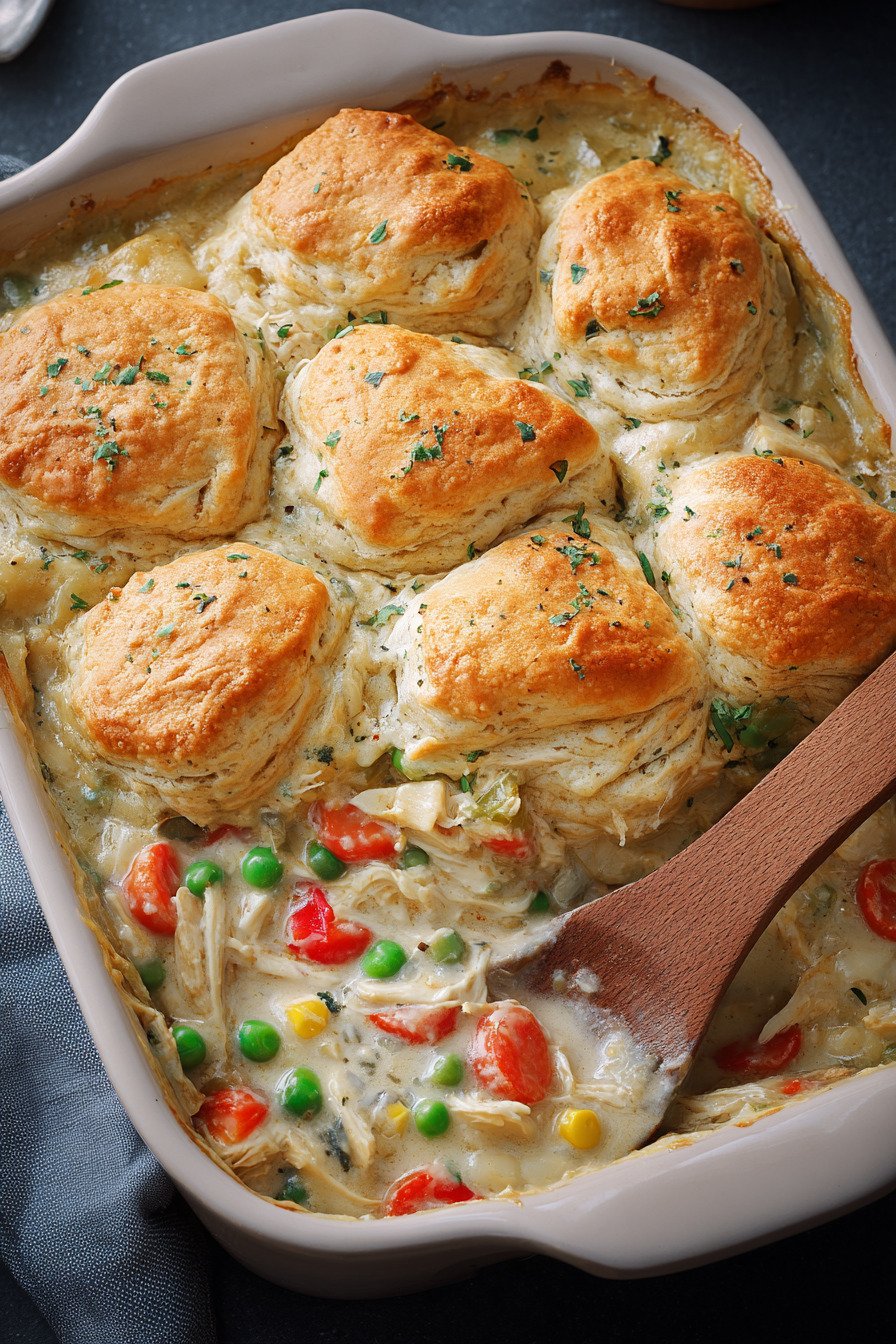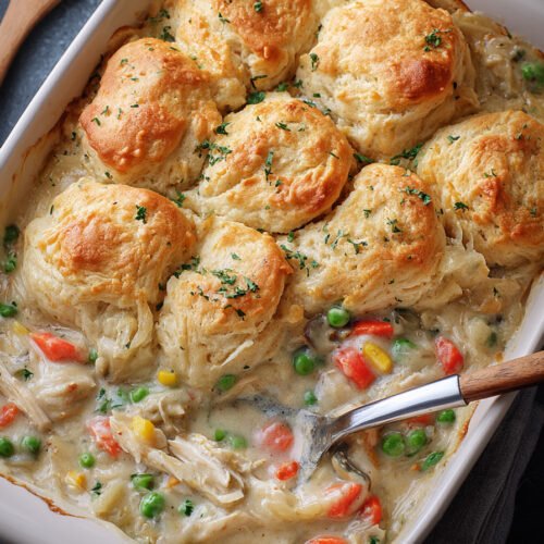 I am Linda from Cook Daily Recipe at https://www.cookdailyrecipes.com and I keep dinner calm and doable. This dish brings soft vegetables, juicy chicken, and a tender biscuit crown. The sauce tastes rich yet balanced. The bake lands on the table fast and the pan cleans with little fuss.