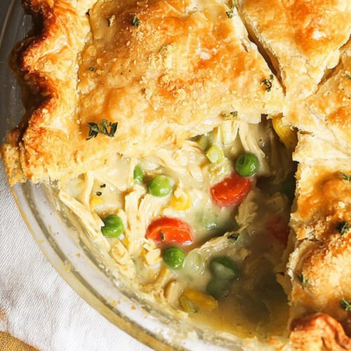 Pie crust or puff pastry A ready crust saves time and still bakes into a crisp lid. Puff pastry gives lift and soft layers. Pick the one you like. Both finish with a deep golden top.