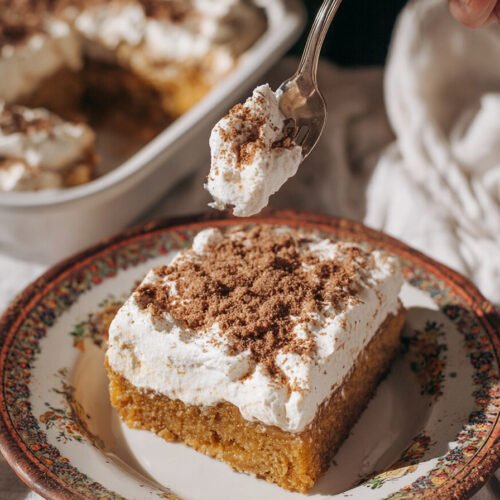 • This cake blends pumpkin spice with a soft tres leches soak that feels comforting.