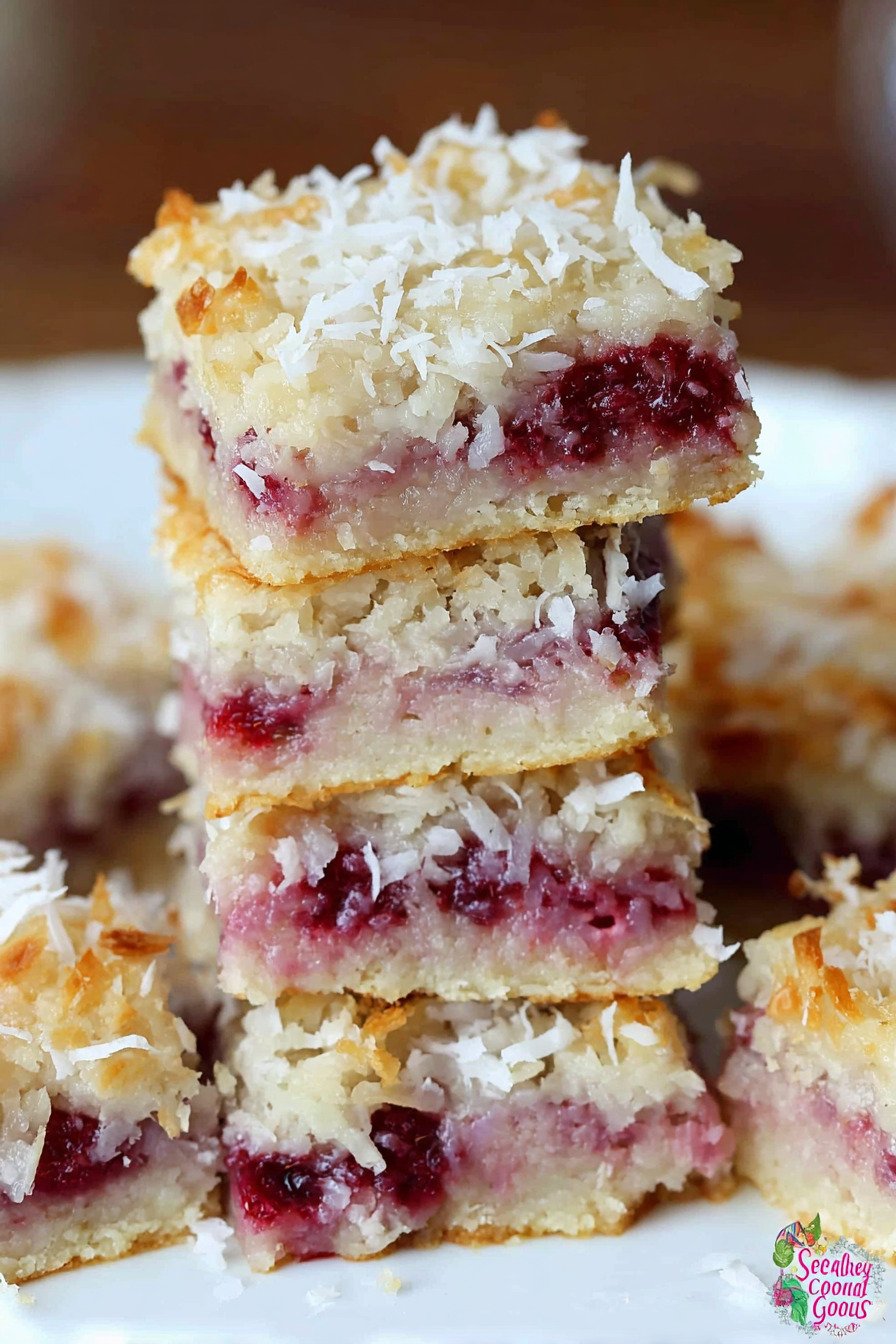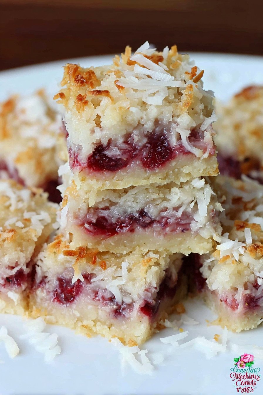 - Scatter the coconut mixture over the raspberry layer and pat gently to level