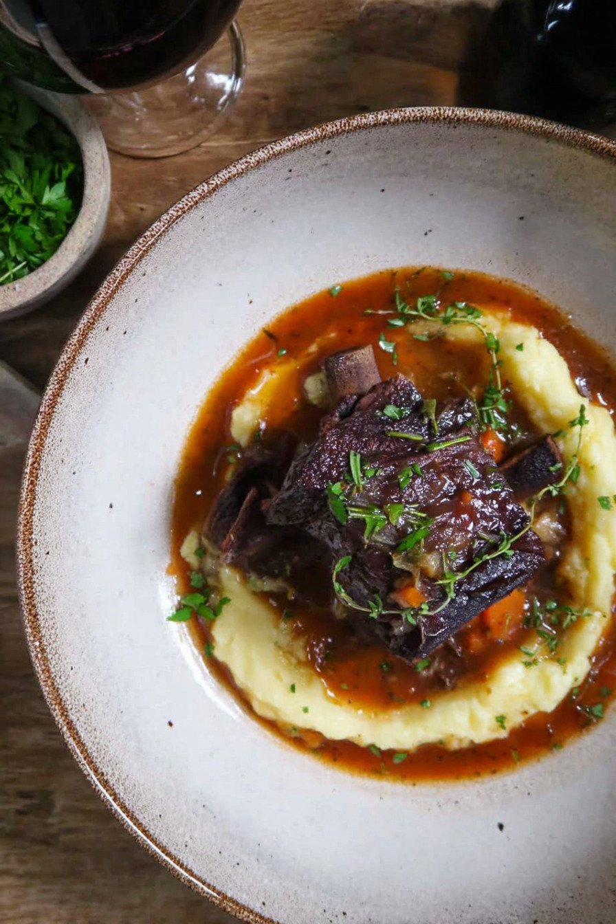 Red Wine Red wine is what gives this dish its signature depth and elegance. It adds body, richness, and a subtle fruity note that makes the braising liquid taste complex and luxurious.
