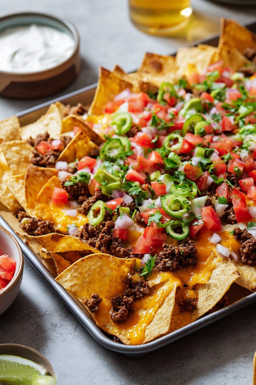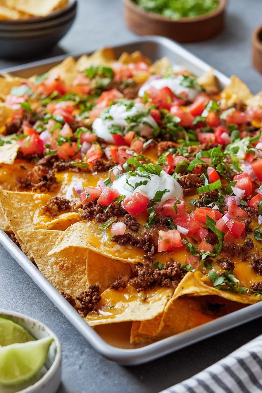 I keep this tray meal simple and fast. Chips meet heat. Cheese melts clean. Toppings stay bright. The method fits busy nights and game days. It scales for two or ten.
