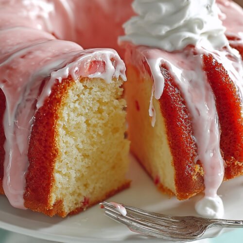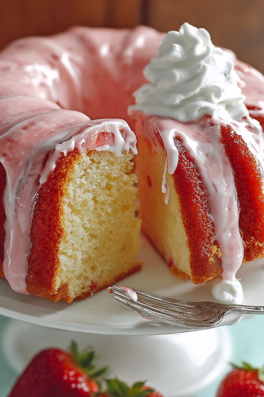 Step 7 Whisk powdered sugar with strawberry puree and a bit of buttermilk until the glaze flows like ribbons. Pour over the cool cake. Let the glaze set and slice.