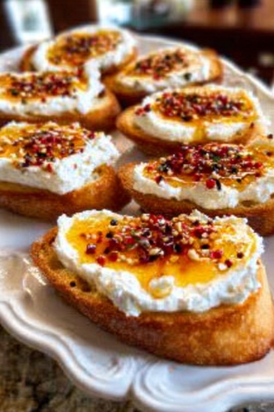 Keywords: appetizer recipes, crostini recipes, easy appetizer recipes, hot honey recipes, party appetizer ideas, sweet and spicy appetizers, whipped feta