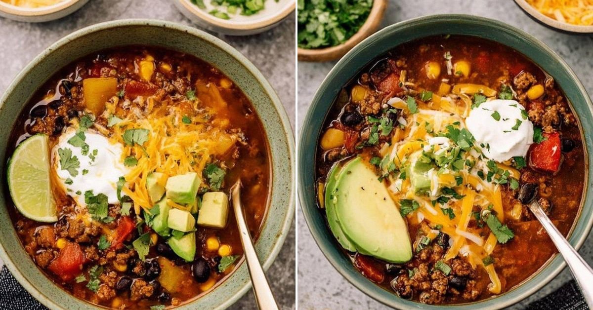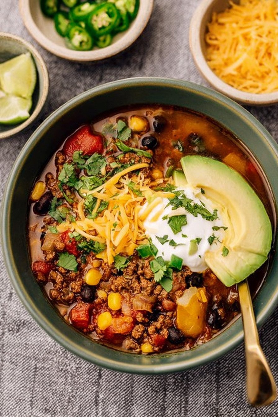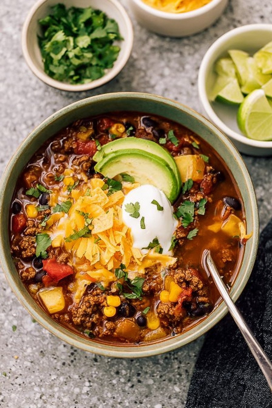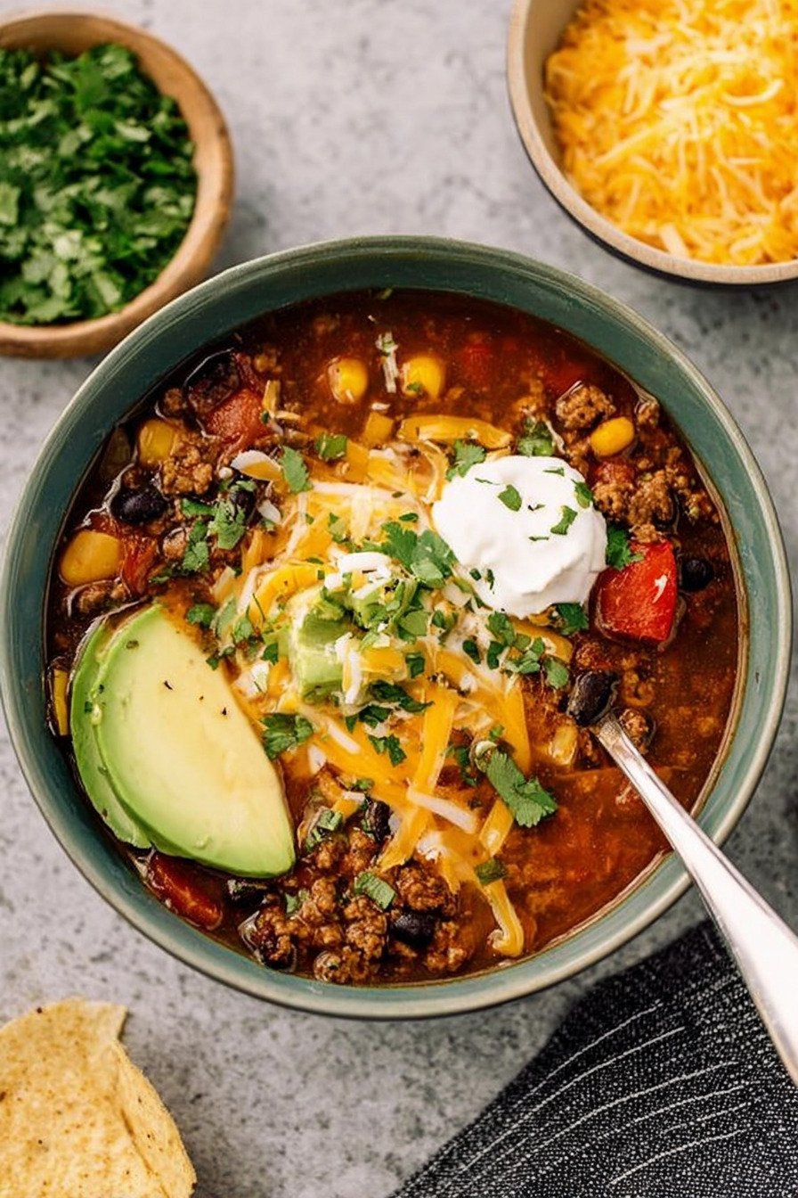 I use a squeeze of lime at the end for lift. A little fresh herb lands well too. Hearty taco soup loves a crisp topper.