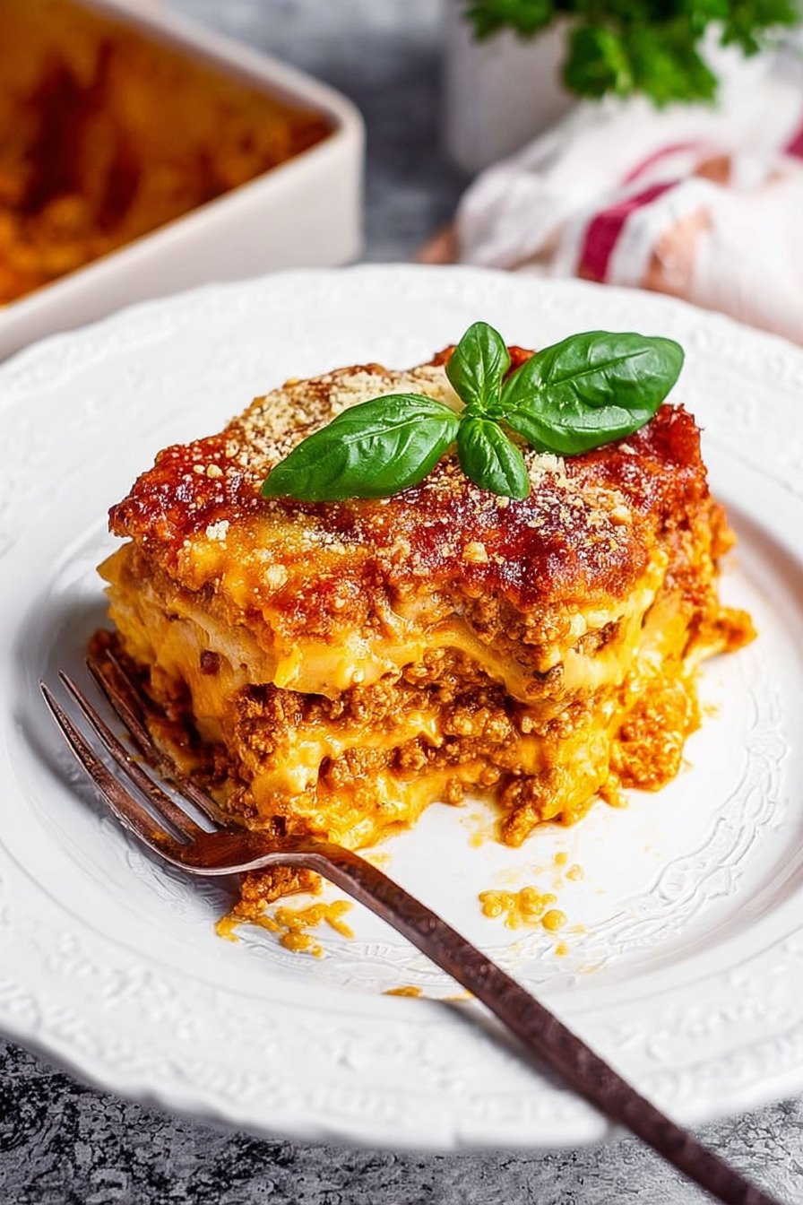 Ground Beef Ground beef gives the lasagna its hearty, savory base and brings the classic richness you want in a satisfying main course. It creates a meaty sauce that makes this dish feel substantial and comforting.