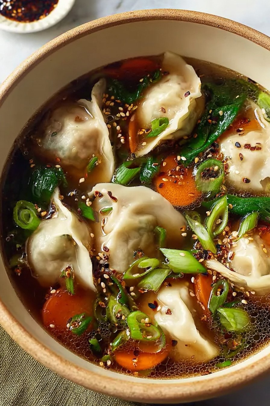 Main idea stays simple. Build a quick broth. Slide in frozen potstickers. Add carrots and spinach. Finish with a ripple of chili oil if you like heat. Asian Cooking roots guide the flavor. The feel stays homey and calm.