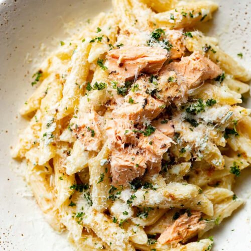 Add the baked salmon chunks and gently fold them in. Sprinkle with fresh parsley and serve immediately.