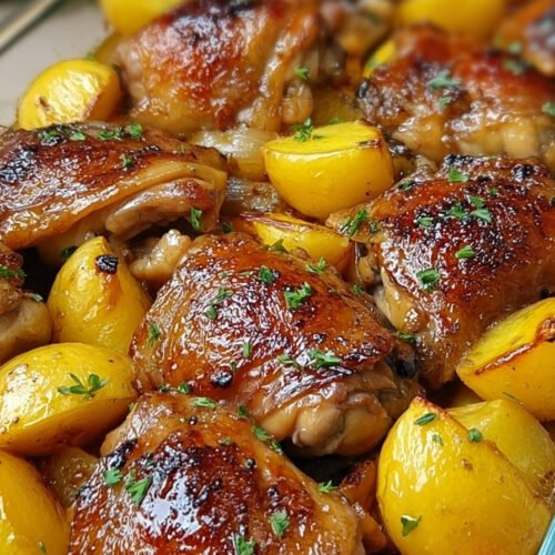 Arrange chicken thighs and potatoes on a large baking sheet in a single layer.