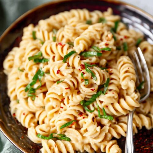 Add the cooked pasta to the skillet. Toss until the noodles are coated in the sauce.