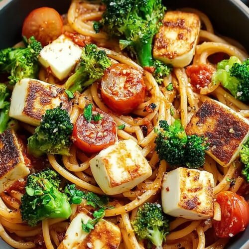 Heat olive oil in a large pot over medium heat. Fry the halloumi cubes until golden on all sides, then set aside.