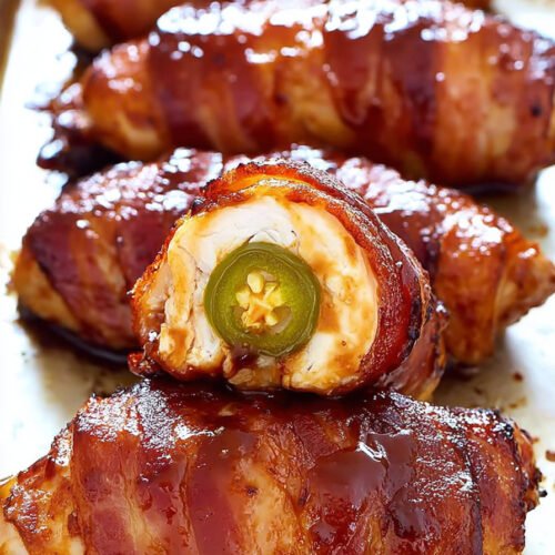 Bake for 30–35 minutes, or until the chicken is cooked through and the bacon is crispy.